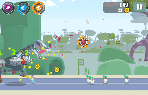 至于场景中的障碍物,其实设计的还算相对简单,绝大多数都无法移动,因此我们只需要巧妙避开即可。在游戏后期整体节奏加快之后我们还会遇到拦截火箭的侵扰,不过这些威力惊人的武器在施放之前总会有一小段时间的预警,玩家可以在看到表示之后进行躲避。游戏的操作非常简单,上、下两个方向的划屛就能够控制角色的跳跃和滑行,可以说上手难度几乎为零。萌萌的霸王龙形象加上如此轻松的操作使得本作在玩家群体这方面有了天然的优势。