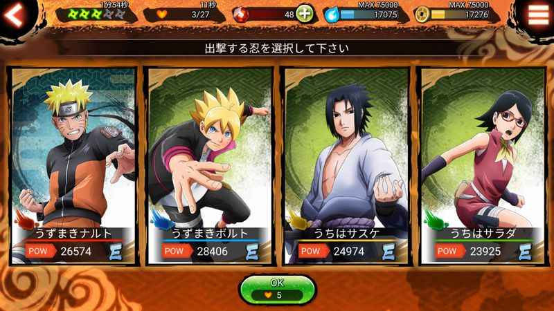 フォーマンセル(4人編成)で部隊を組むことができ、『NARUTO』と『BORUTO』のキャラクターを自由に編成して任務(ステージ)を遂行していく。