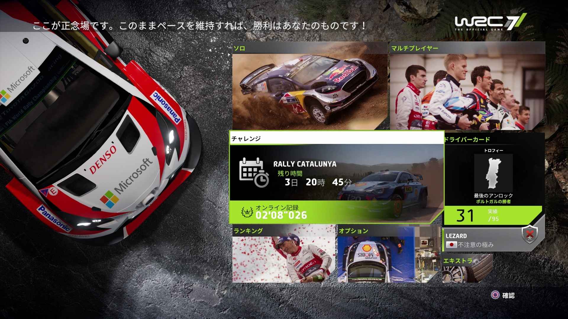 まず「WRC」というモータースポーツを題材にしている以上、前作からゲーム内容に変化が少ないのは宿命だろう……というか、UIに若干の変化がある程度であとはほとんど同じだ。ソロモードは「クイックレース」や「キャリアモード」。オンラインは、最大8人のプレイヤーがお互いの姿をゴースト表示しながら同時にタイムアタックをする「マルチプレイ」や、特定のシチュエーションで世界のプレイヤーとタイムを競い合う「チャレンジ」など、良くも悪くも代わり映えがない。