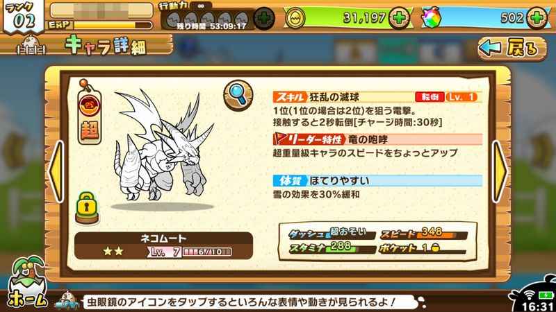 各ひよこには、スピードやスタミナといった基本的なステータス以外に、重量が設定されている。