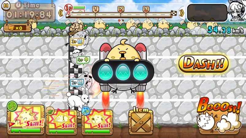 ブーストは、走者のスピードを一時的に大きく上昇させるほか、障害物やほかのひよこをふっとばして進ことができるようになる。