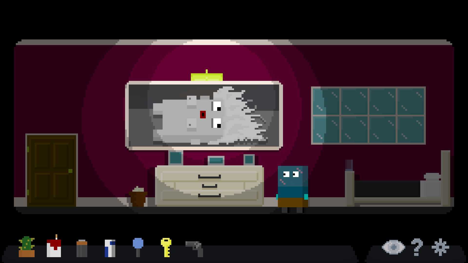 The Mind of Marlo sports adorably chunky pixel artwork that’s both simple and exceptionally charming, with or without the optional film grain. Each silly head is distinct and unique, and their varied appearance often adds a little extra humor to some of Marlo’s more depressing anecdotes. Watching the shark head discuss our hero’s failed love life and his desire to burn his ex-girlfriend’s belongings in the backyard brings the laughs even though the subject matter itself is pretty bleak.