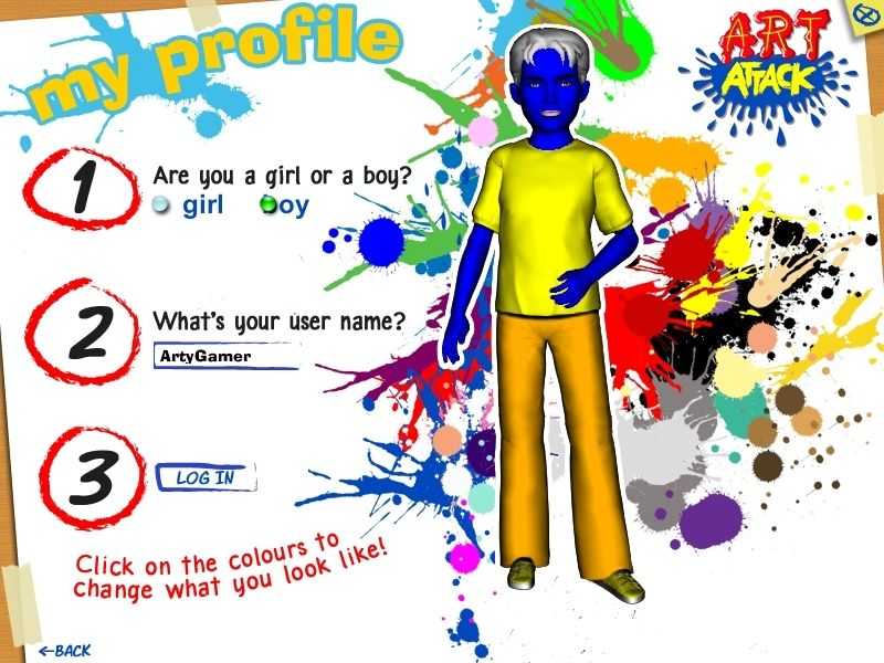 player selects their gender and then uses the splashes of colour to configure