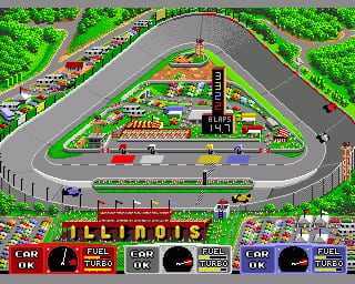 A 3-player, Indy style racing game with 5 cars that each race around 15 of Danny Sullivan’s favorite tracks. Players can turbo, crash, catch fire, and lose fuel, but they may pit stop for repair. Danny himself always races (yellow car) and players can earn money for more turbo, faster pit crew, acceleration, brakes, and tires.