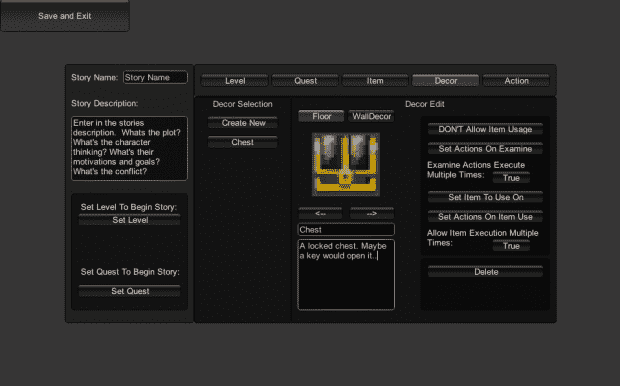 In Defan’s Story, the player runs through levels trying to complete missions they acquire while avoiding being caught by the guards. Missions in the game can include acquiring certain items, killing certain guards, gaining access to certain areas, and escorting NPCs to designated areas. All levels built within the game are built through a custom level builder designed for this game that will be open to the player to use and publish for other players to play.