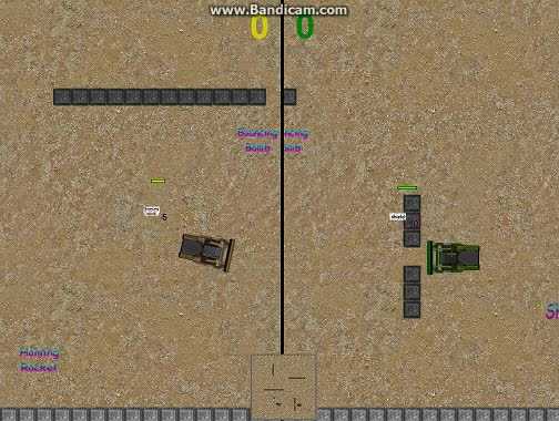 Game mode: 1 versus 1, split screen, for two (human) players. 2D game, camera view from above, mini map on screen. Players can fight each other, there are 4 power ups to pick up in game, that are: 1) Auto aim missile, 2) bouncing bomb, 3) Shield, 4) Toolbox (it restores energy). The first 3 pickups are ammo-limited, 10 shoots per pickup; the toolbox restores the energy upon pickup. BETA Version.