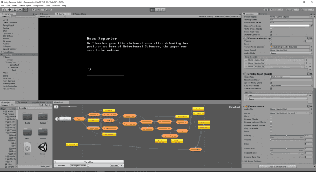 I originally started work on this game using the Ren’Py engine, however I have since then moved all the written elements into Unity 5 with the Fungus visual novel Unity Asset pack. This has greatly help my productivity as it allows for far finer control over audio and allows me to distribute the game as an HTML5 webpage using WebGL.