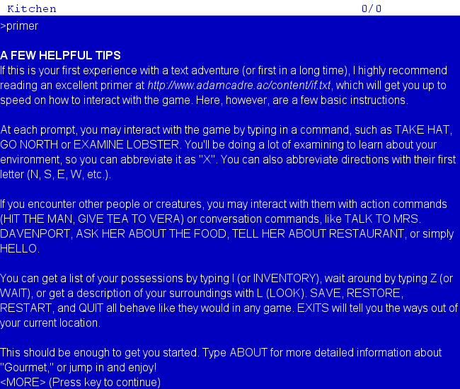 Gourmet is a comic text adventure set in a restaurant. A week after the
