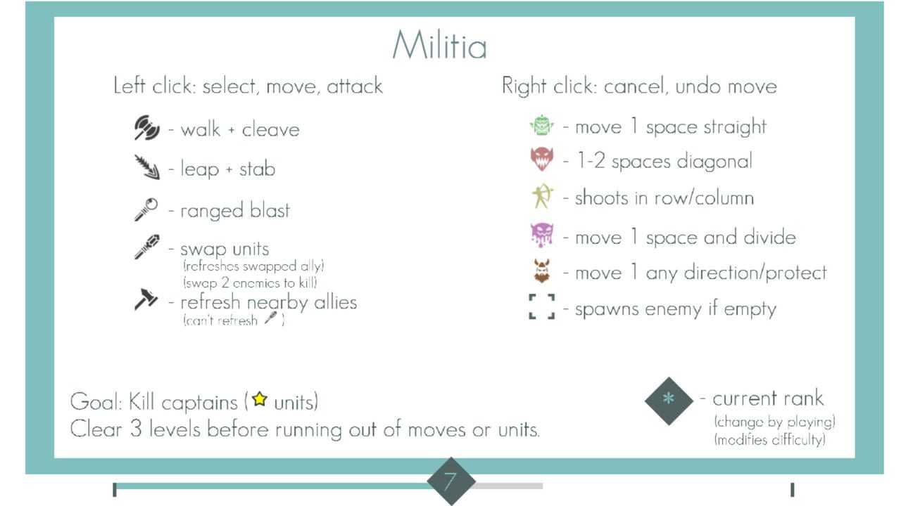In Militia, you are the leader of a small troop of warriors, mages and cavalry and attempt to rout the local marauding banditry by dispatching their captains. Gameplay is turn based; on your turn you can issue one command to each of your units, and then the enemies each move on their turn according to strict and transparent movement rules.