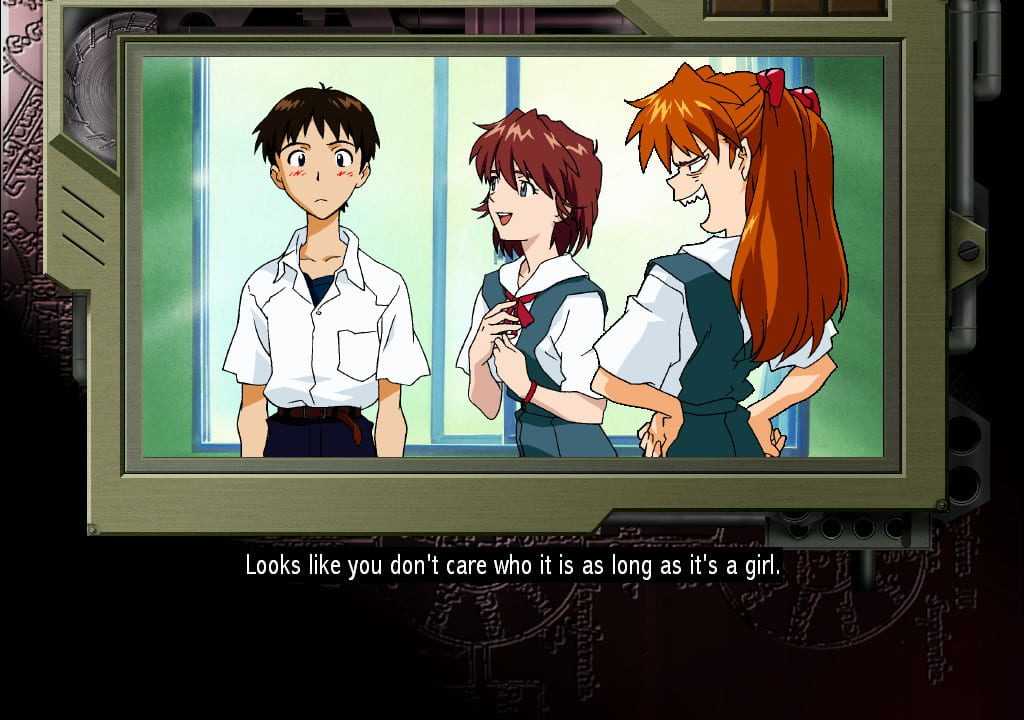 The interactivity in most of the game is limited to walking around areas until the next plot event is triggered. However, the one true branch occurs at the end of the game, where the player may choose to focus on Mana, Asuka or Kaji. This choice determines which of the game’s three endings are shown, with a fourth exclusive to the PS2.