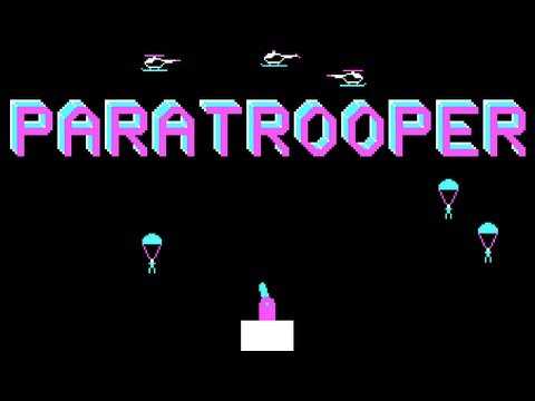 Paratrooper is a single screen arcade action game where the player controls a stationary machine gun turret trying to shoot down all incoming enemies. The turret has unlimited ammo but a limited angle of fire (up to 90 degrees left and right).