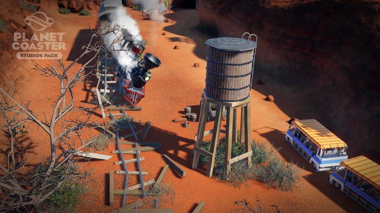 You are the director! Create legendary moments and epic scenes with the new Planet Coaster Studios Pack. Build the ultimate backlot tour and bring the blockbuster experience to life with spectacular stunts, dramatic effects and rides that put park guests in the heart of the action. Featuring Hollywood props, movie set backdrops and action-packed animatronics, the Studios Pack unlocks an all-new theme park adventure.