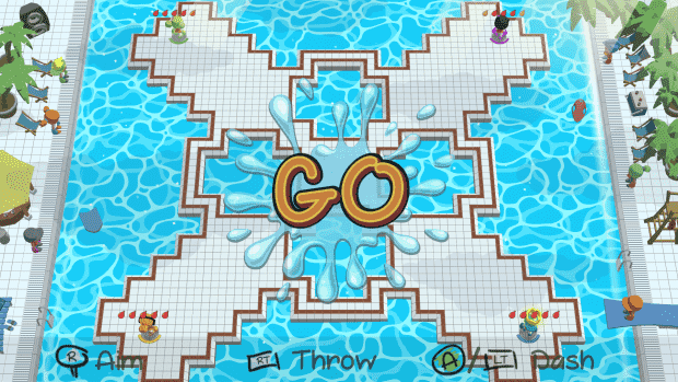 The challenge is: Throw **waterbombs** towards your friends and push them into the **pool!**