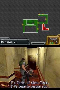 The game makes use of the dual screen display with the top screen used to display the map, along with the player’s remaining ammunition and health (determined by the color of the background); while the bottom screen displays the main action, and can be switched to show the player’s inventory. The DS version also includes updated play mechanics: the 180-degree turn introduced in Resident Evil 3: Nemesis, along with the knife button and tactical reload from Resident Evil 4. The updated controls are applicable to both Classic and Rebirth modes. Dialog and loading screens can now be skipped. The live-action footage was still censored, even in the game’s Japanese release; however, the scene showing Kenneth’s decapitated head was kept.