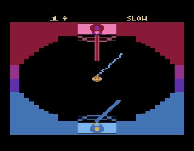 In Jedi Arena, you have to face an opponent in the arena to see who is the true Jedi master. Wandering throughout the arena is a seeker which is capable of firing laser bolts. To be victorious you need to destroy your opponents shield by having the seeker fire laser bolts at it. You are armed only with a light saber which is used to control the direction of the laser bolts you fire, as well as block incoming fire from your opponent.