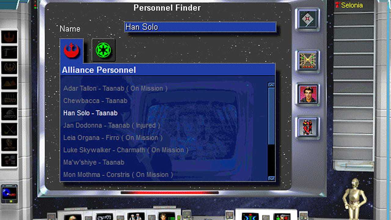 | Game Analysis | The player assumes the role of a military administrator and takes control over either the Galactic Empire or Rebel Alliance. The game interface consists of a map of the Star Wars galaxy and an advisor droid (this position is taken by C-3PO for the Rebellion and IMP-22 for the Imperials). The map consists of sectors of 10 systems each (the number of sectors is customisable to be either 10, 15 or 20), all known from the Star Wars universe. Some of them belong to 'unknown' regions and need to be explored while known systems can be either under control of one of the two main factions or neutral at the start of the game.The player has to take care of his or her faction, which involves colonization, diplomacy, creation of buildings and units, supervising of mines, refineries, and stockpiled resources, building and commanding fleets in a tactical mode, conversion of systems to one's own side through various means, recruitment of characters, and dispatching characters or units to systems or fleets, and finally the assigning of missions to characters and special forces | |