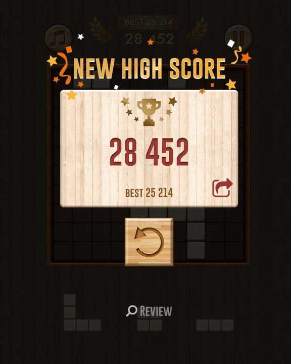 Five months of daily play, and it’s still fun. Many puzzle games have levels that get progressively more difficult, until I get to the point where it’s just not fun anymore, and I stop playing. Wooden Block Puzzle has just one level. It is always the same… never gets harder to play. But it never gets boring, and has actually become more fun the longer I play, because the possibilities are endless, and the challenge is built-in. You can try to beat your own high score… or not. Very well-crafted by some genius developer. Thanks, Dev.
