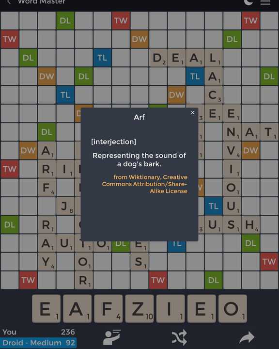 Create words with the 7 letters on your rack and place them on the 15 by 15 tile board. Boost your score by placing letters on the special Double Letter, Double Word, Triple Letter and Triple Word tiles.