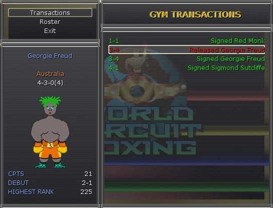 World Circuit Boxing is a boxing management game with RPG, strategy, and simulation elements. WCB lets you take over a gym or control the entire boxing world. Watch your fighters in the ring, working their corners; or equip and train them, and let them handle their own business. In World Circuit Boxing, you have the ability to restore the sweet science to the days when the only ducking was done in the ring!